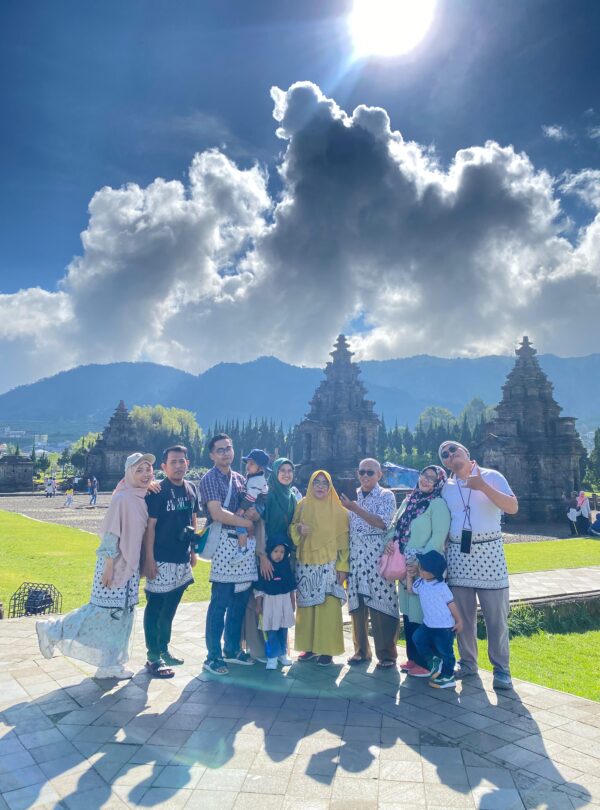 The family group enjoys a cultural visit to the ancient Arjuna Temple in Wonosobo